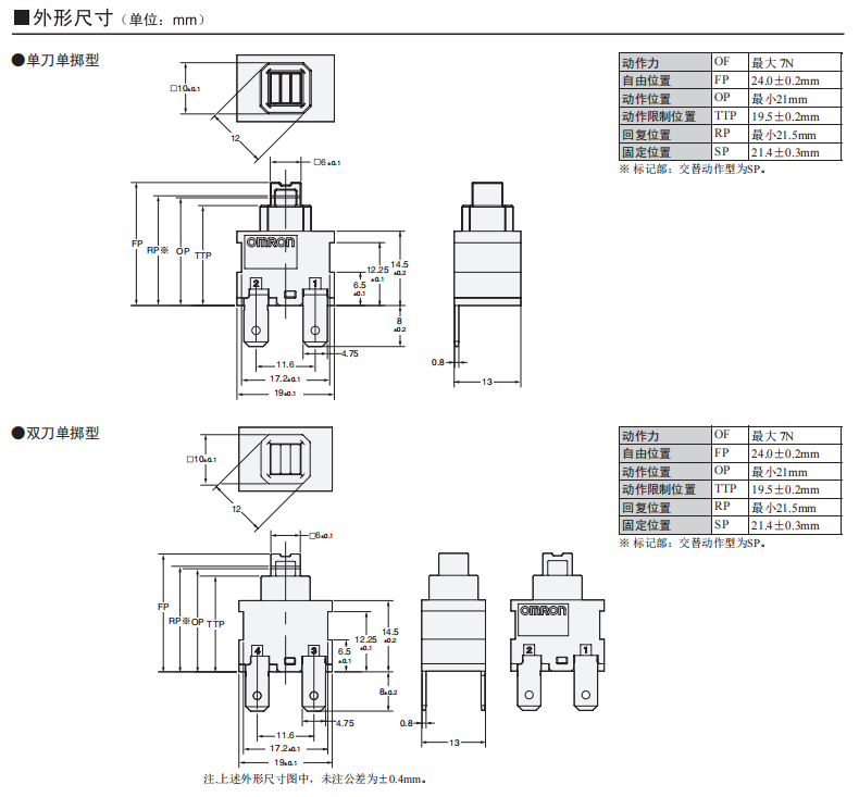 接點間隔3mm以上的小型電源開關 采用特定的速斷機構,可進行功率負載開、閉。開、閉利落、良好的操作感。 確保接點間隔3mm以上。 符合UL、cUL標準、符合EN標準。