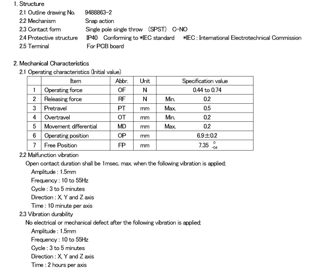 D2FC-F-7N(10M), 克力為:60+/-15G,壽命為1000萬次;